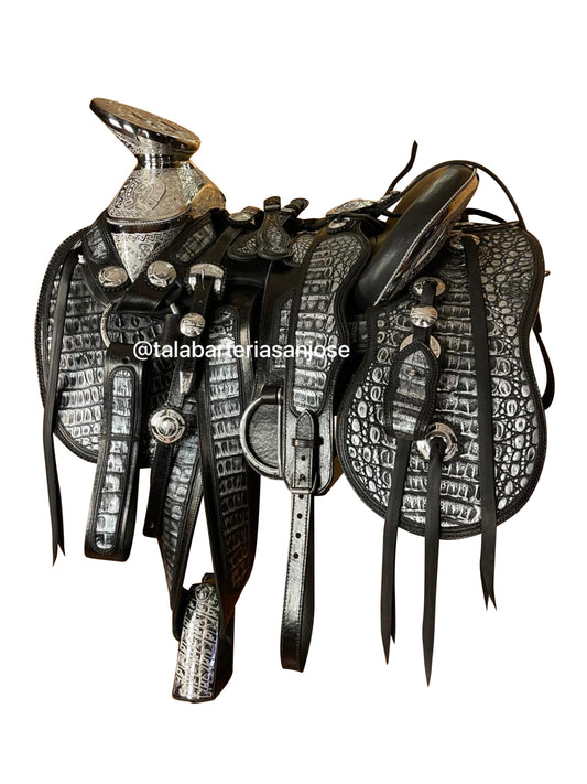 -Montura con aplicaciones en piel de avestruz 100% original.-Fuste y herrajes en acero inoxidable.-Cola de...
