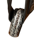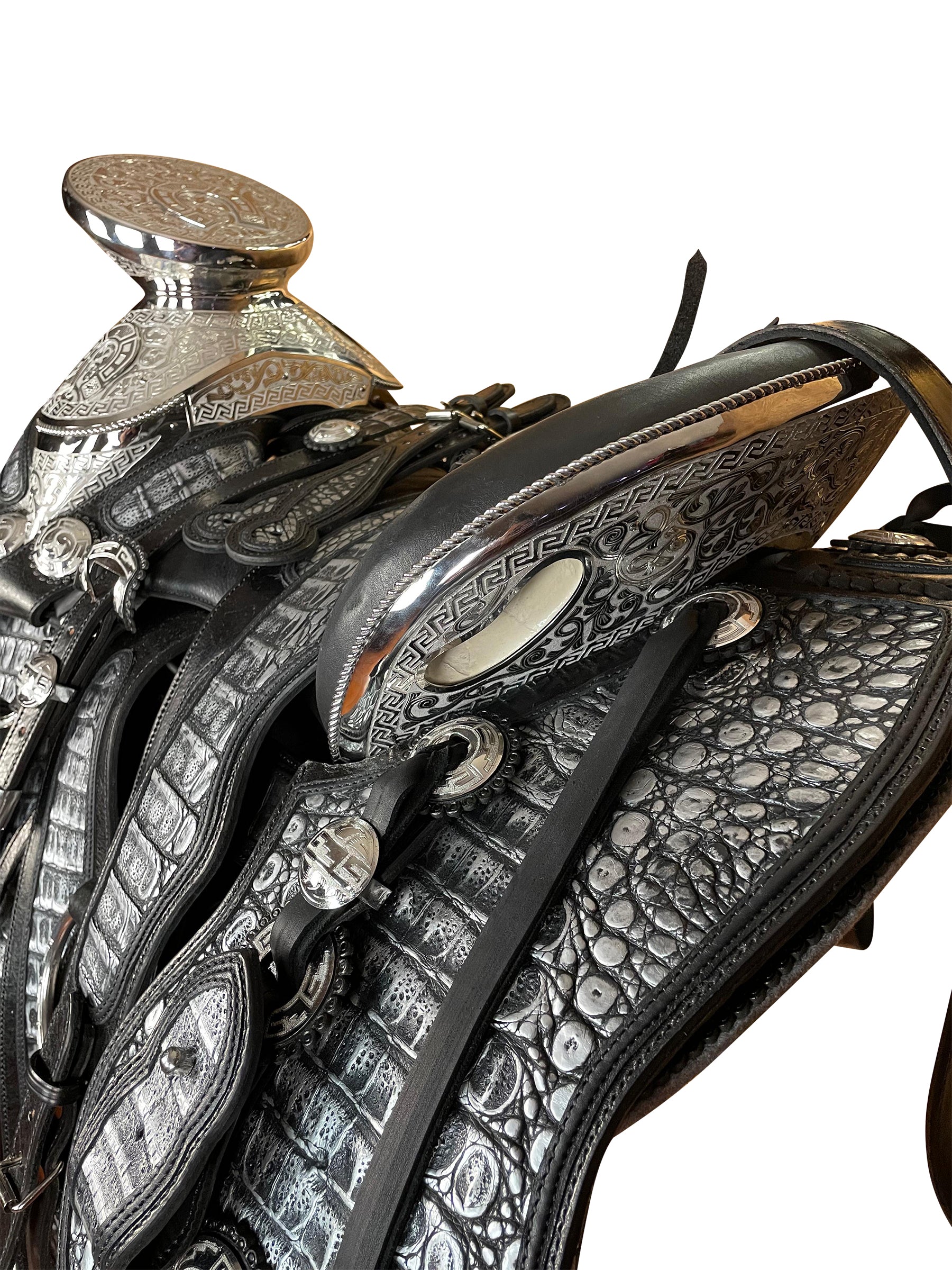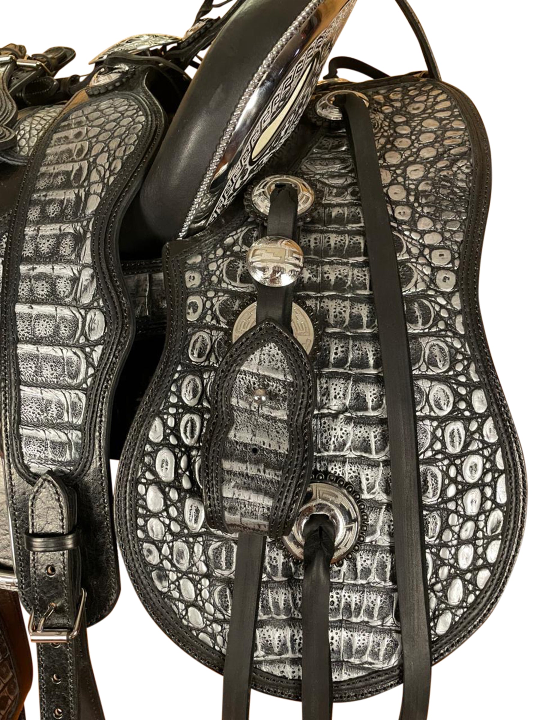 -Montura con aplicaciones en piel de cocodrilo 100% original.