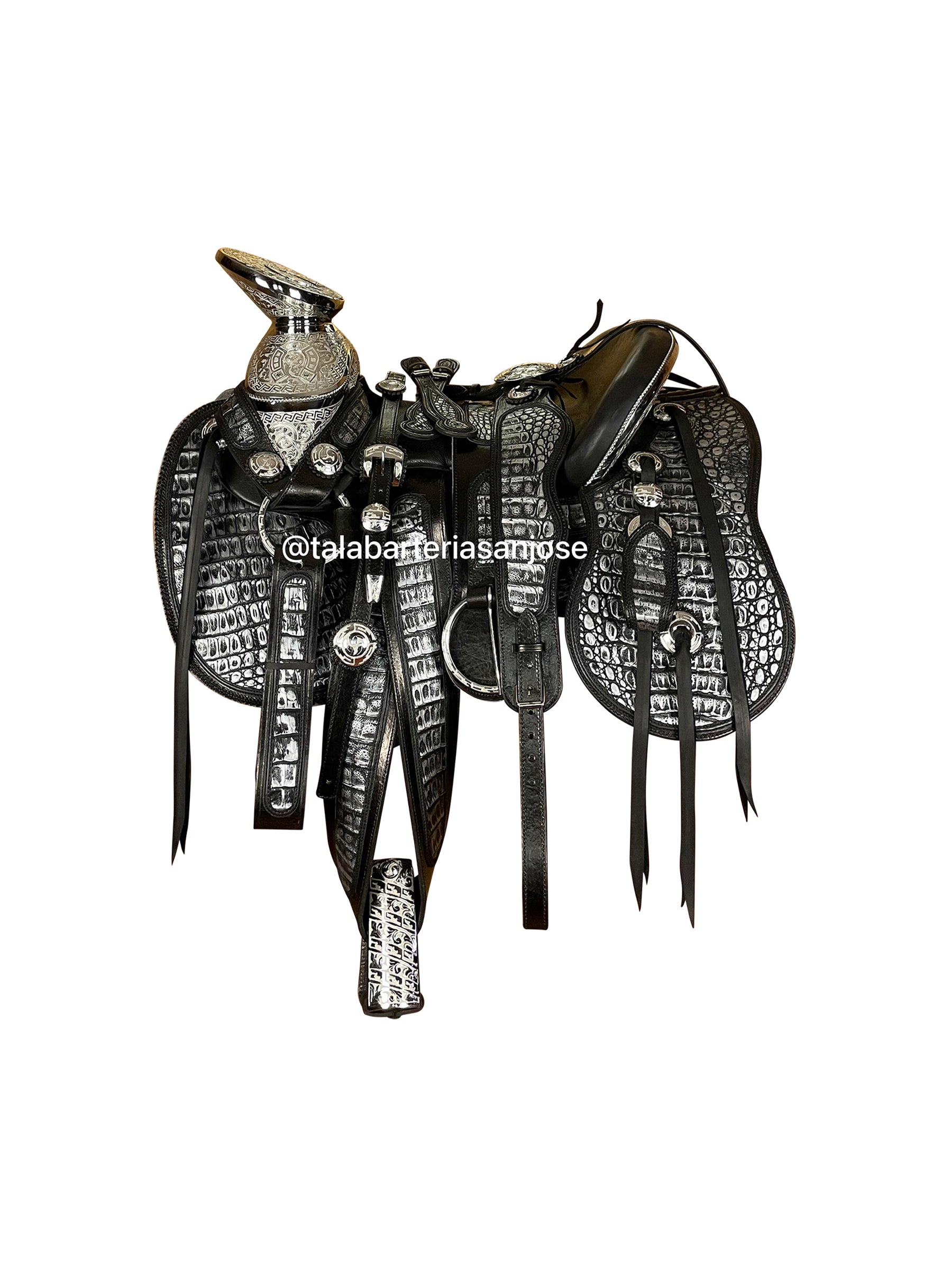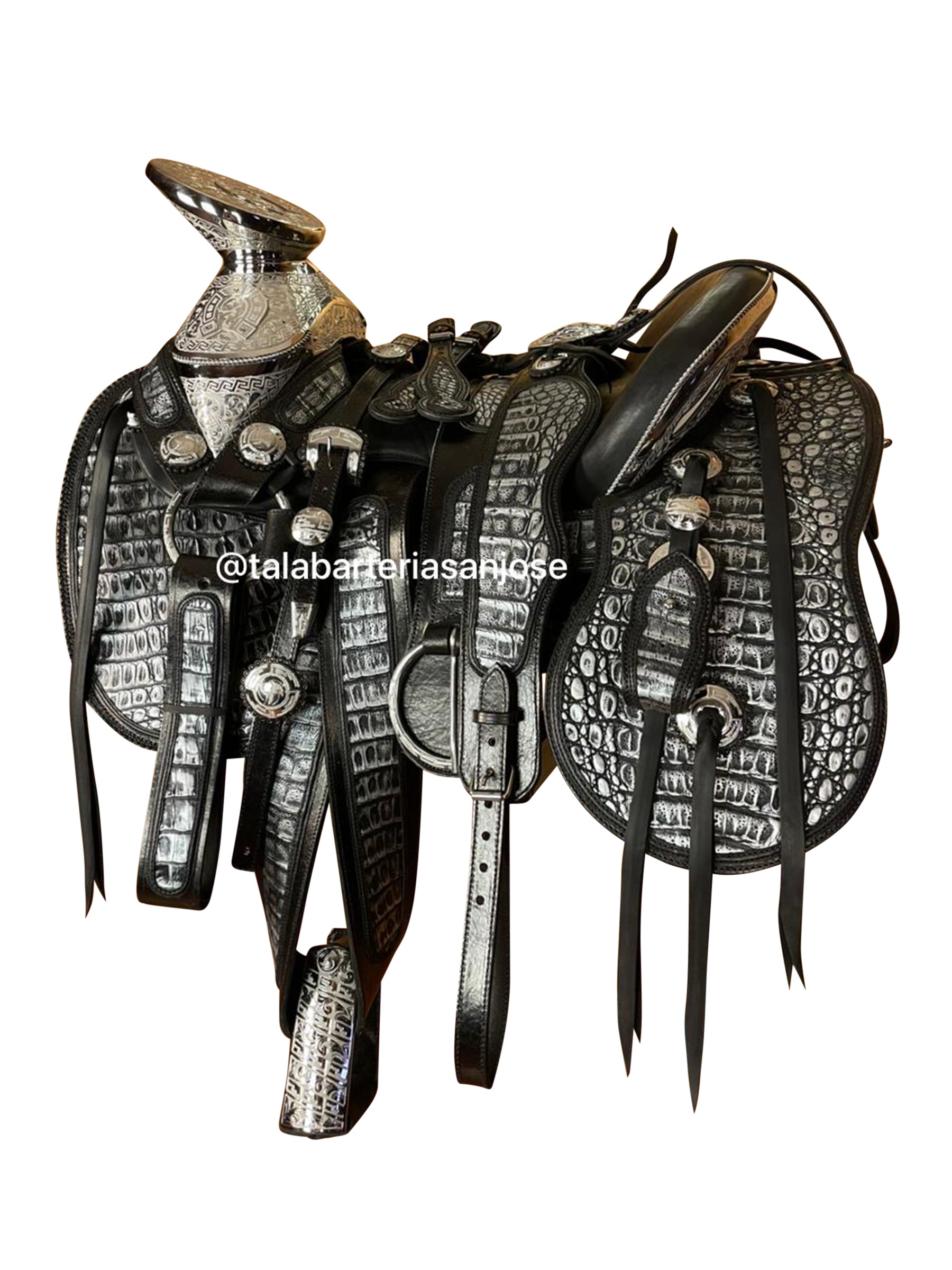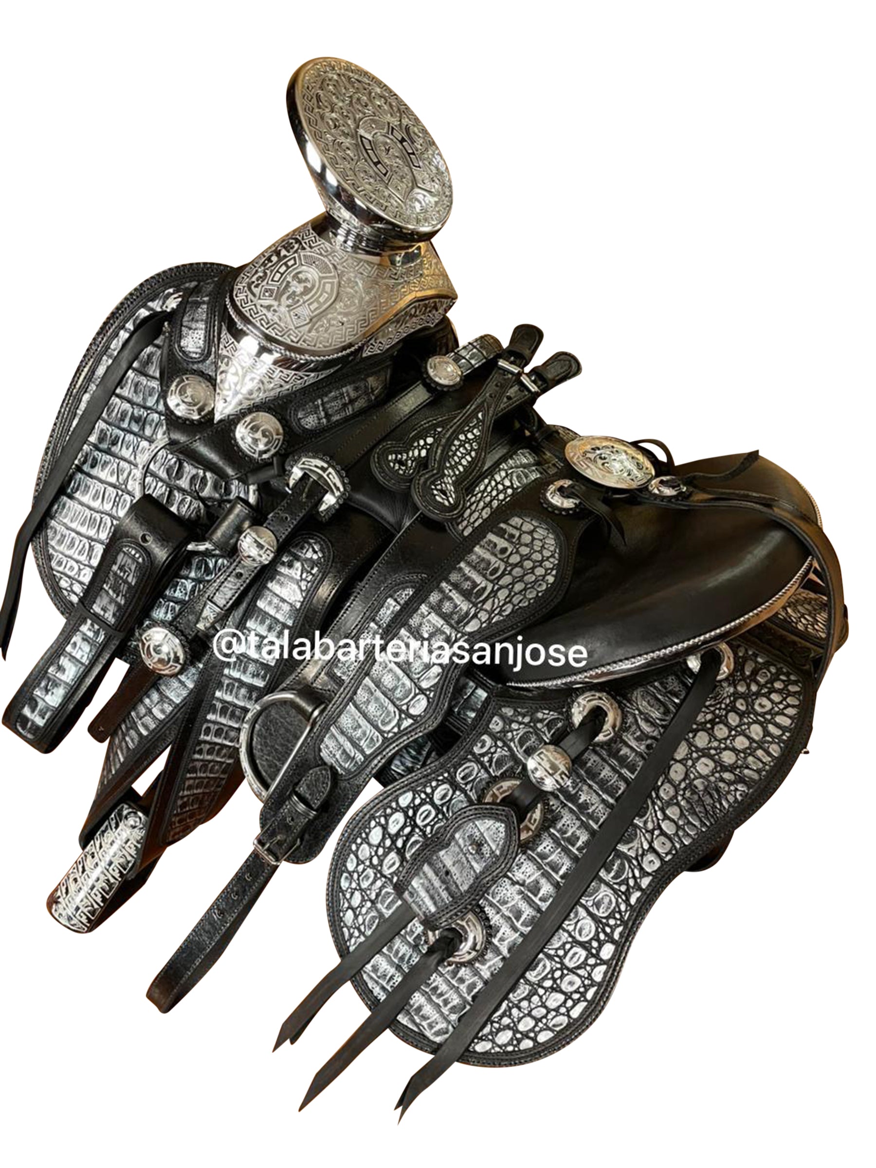 Cabezada, pechopretal con bajador y centro de pecho, cincho, correones para las espuelas.