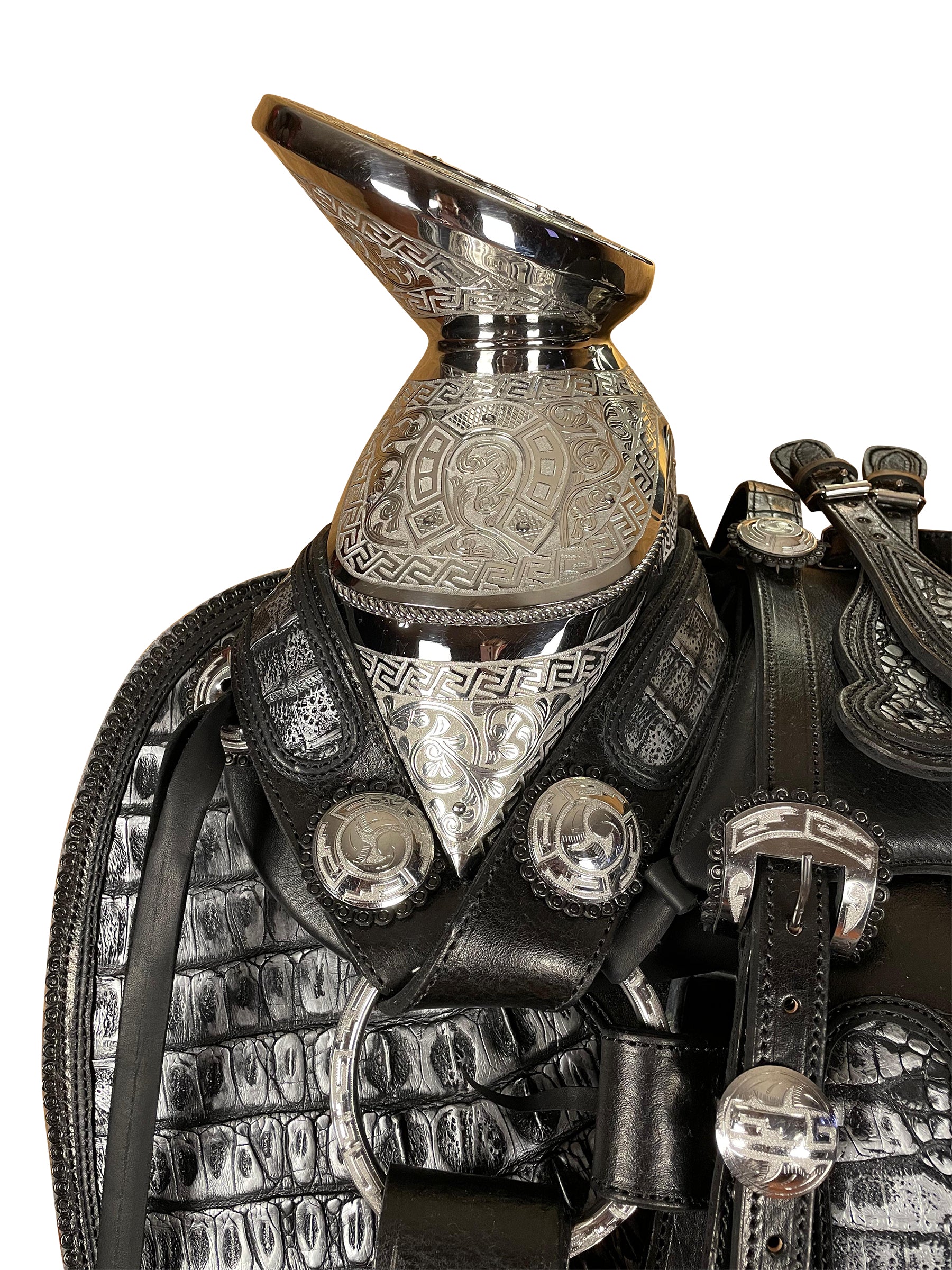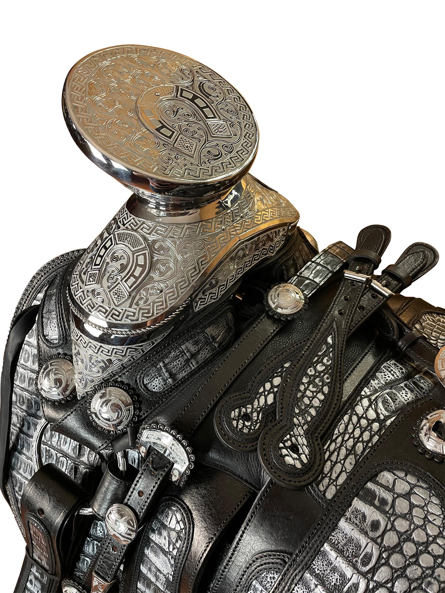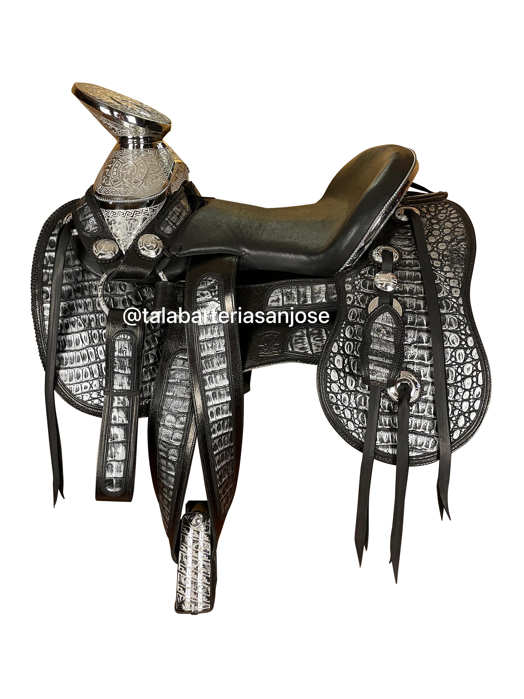 Cabezada, pechopretal con bajador y centro de pecho, cincho, correones para las espuelas.
