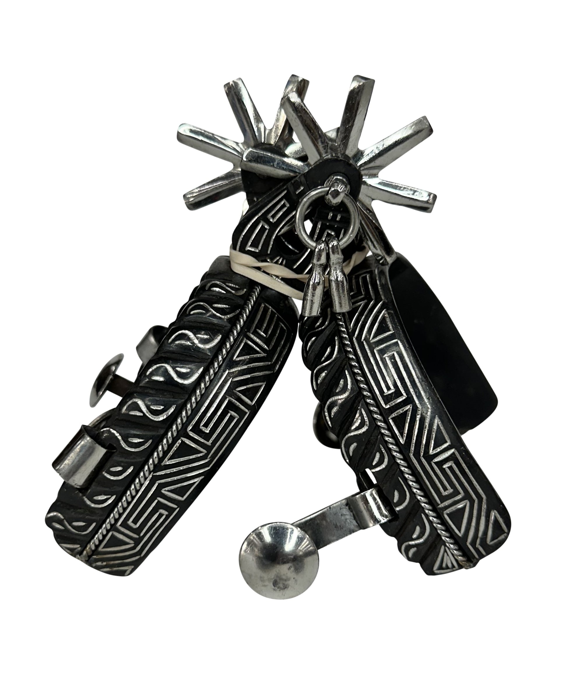 Espuela delgada de acero inoxidable escarbada con acabado en pavón negro.