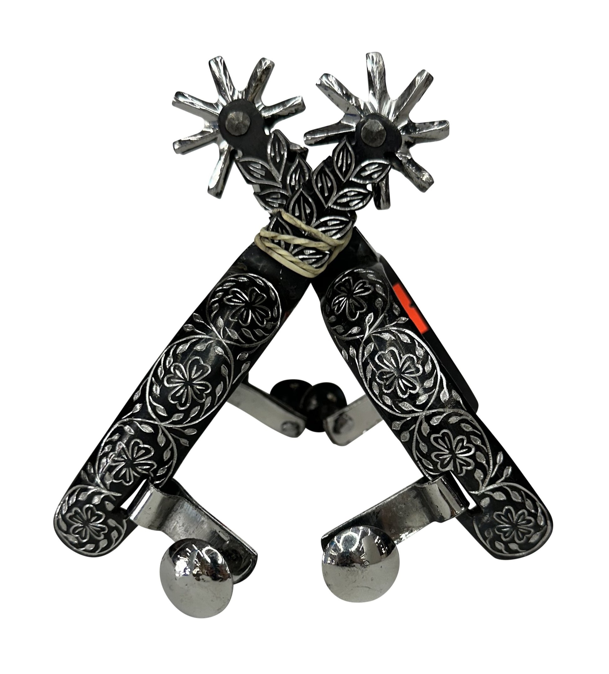 Espuela delgada de acero inoxidable escarbada con acabado en pavón negro.