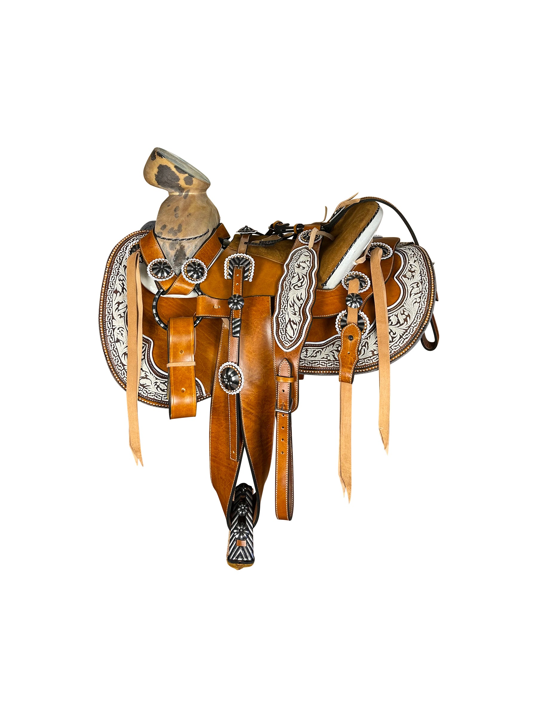 Ya con todos su accesorios: Cabezada, pechopretal con bajador y par de correones para las espuelas