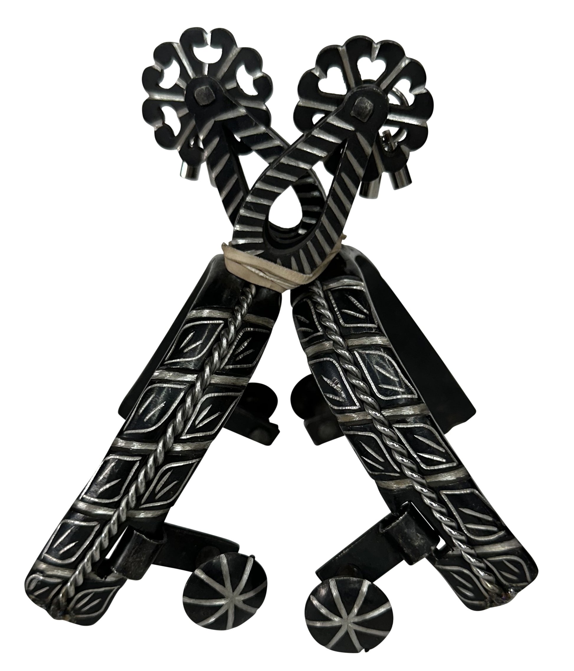 Espuela delgada de acero inoxidable escarbada con acabado en pavón negro.