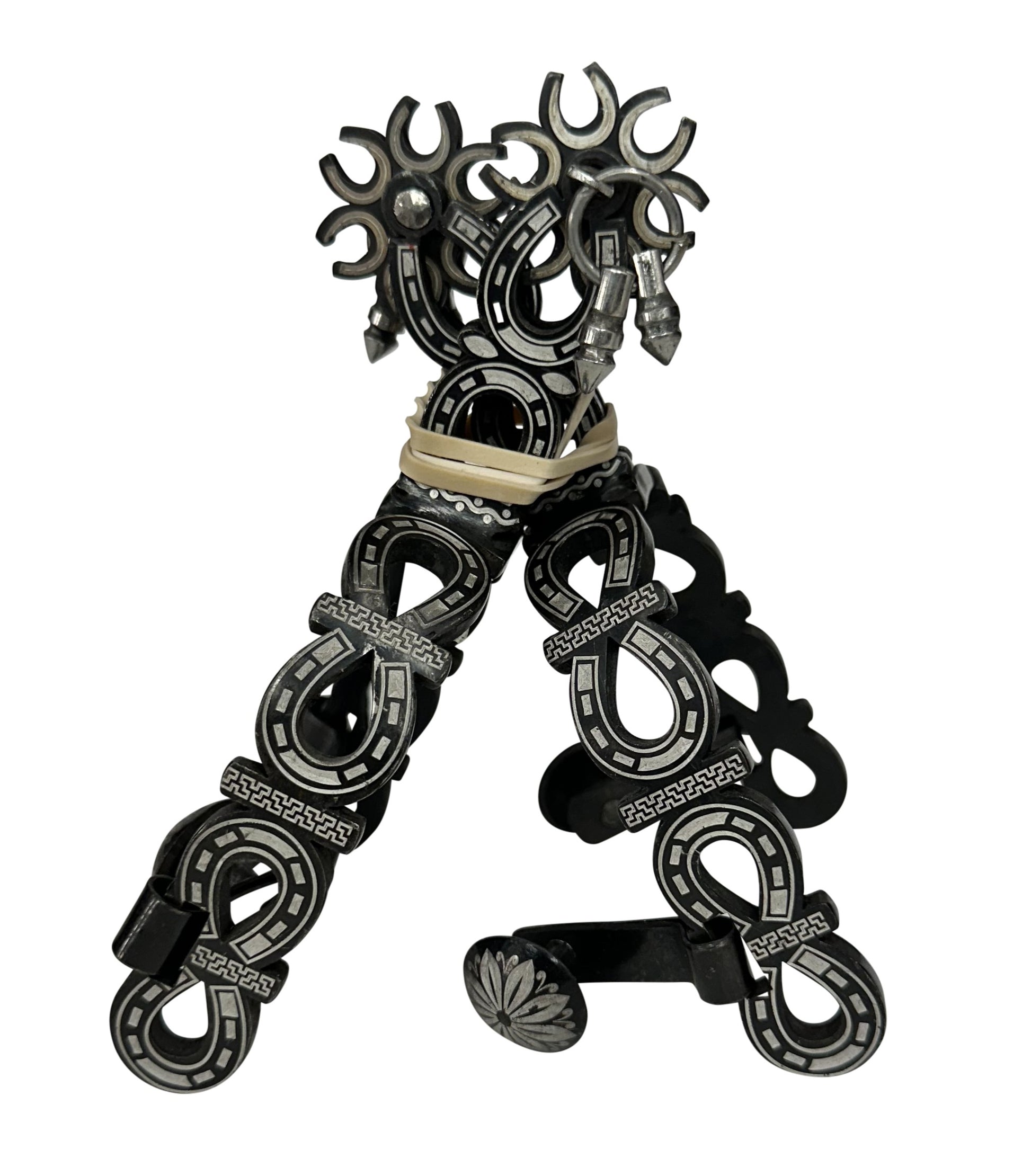 Espuela delgada de acero inoxidable escarbada con acabado en pavón negro.