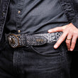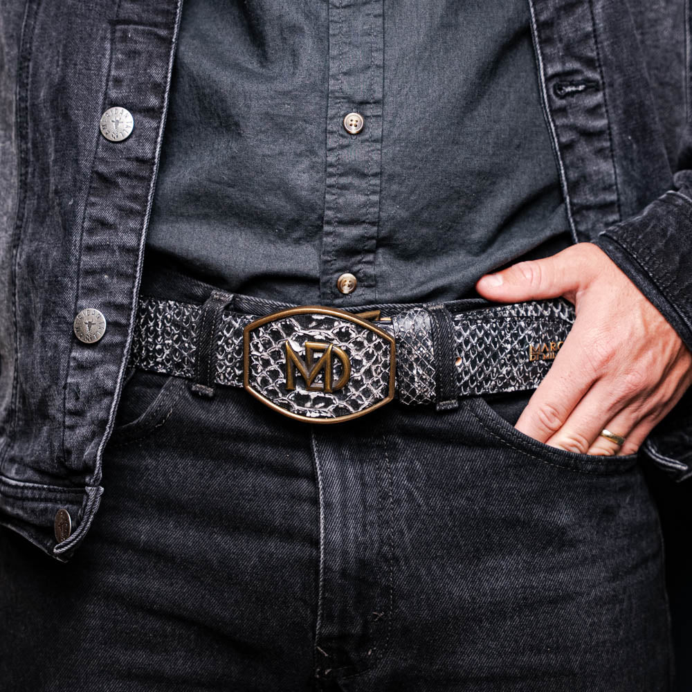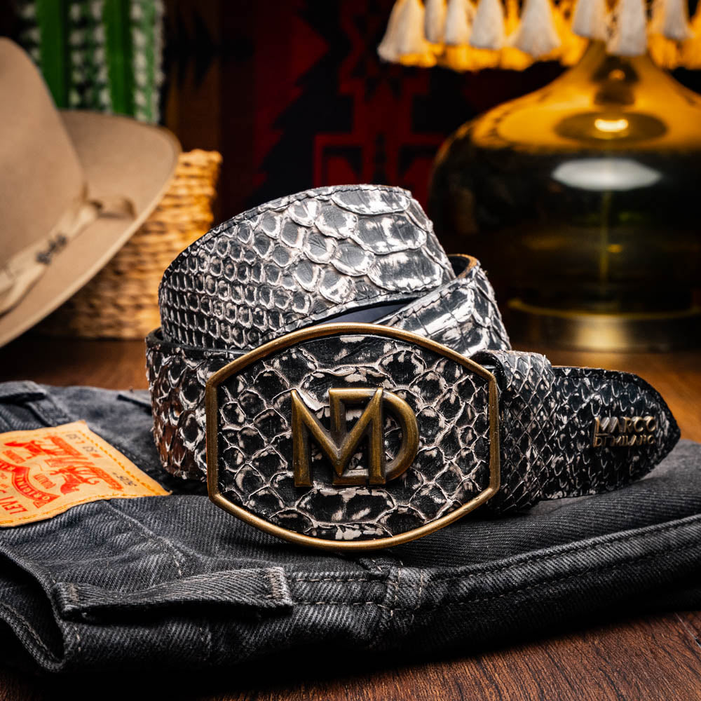 The ARKANSAS belt is a bold expression of exotic elegance, handcrafted from genuine python skin with its naturally striking texture and scale pattern. A polished antique brass buckle in Western style adds just the right amount of rugged refinement, while the full-grain leather lining—dyed to match the exterior—delivers comfort and durability with every wear.
