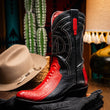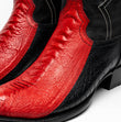 The DENVER boot delivers bold style and exotic elegance with every step. Crafted from genuine ostrich leg skin, this round-toe boot showcases the natural ridges and grain of the leather—rich in detail and unmistakably luxurious. Its deep red vamp is perfectly balanced by a black full-grain leather shaft with matching red stitching and pull tabs, bringing together contrast and craftsmanship in true Western fashion.