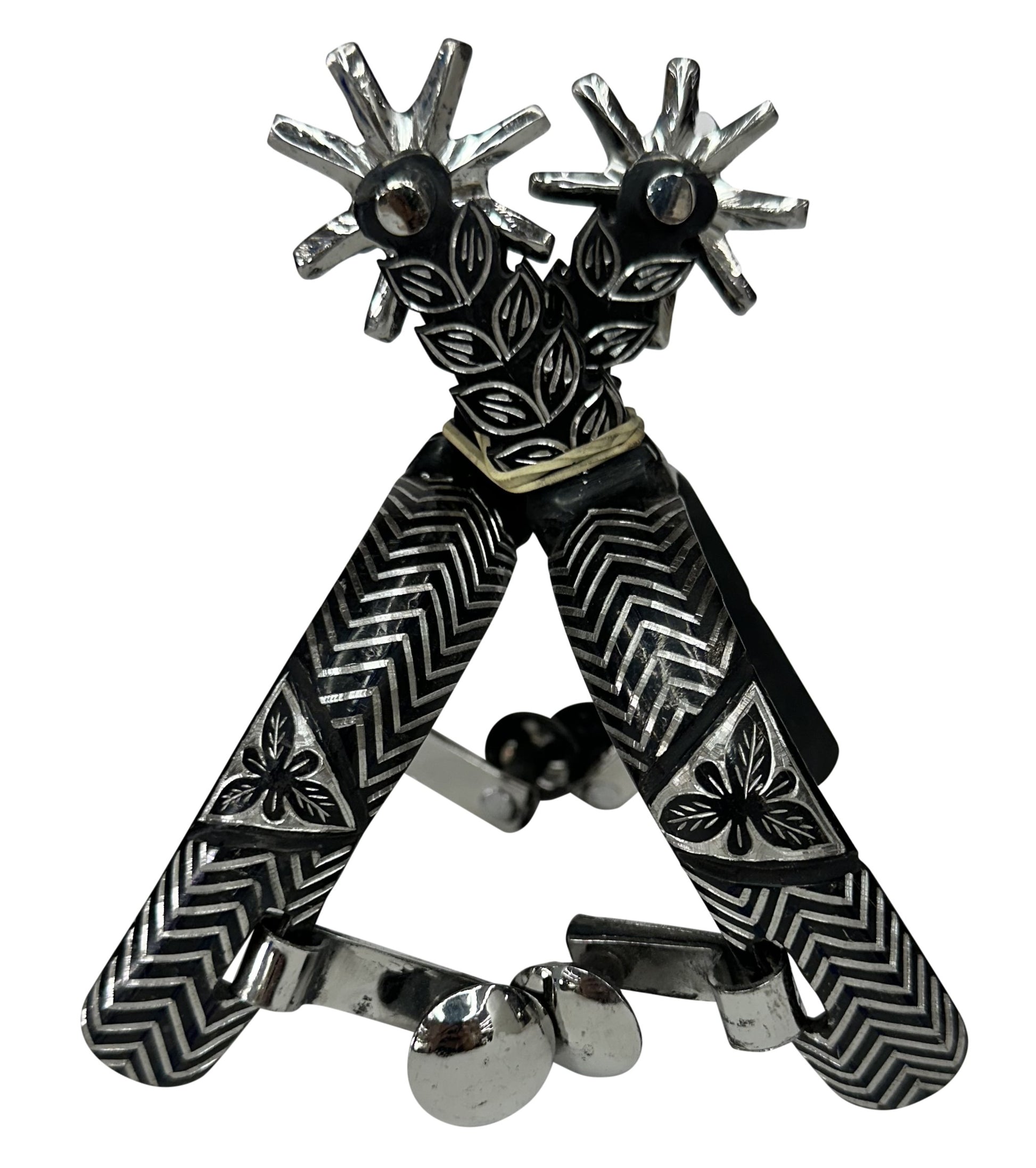 Espuela delgada de acero inoxidable escarbada con acabado en pavón negro.